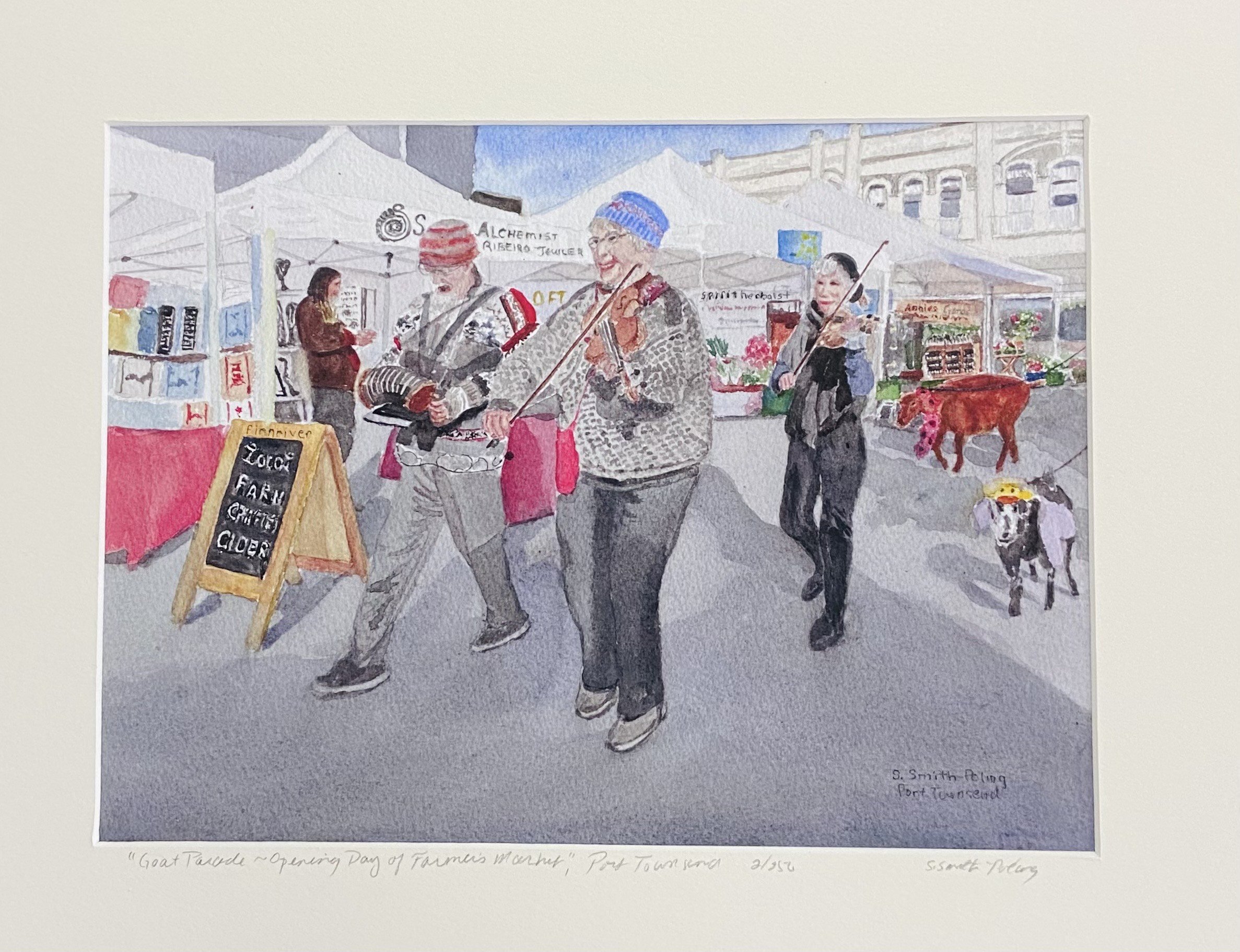 From painting European harbors with her father to depicting Port Townsend’s Goat Parade and Farmer’s Market, her work celebrates both the grand and the familiar. She has painted everything from the Wooden Boat Festival to commissioned horse portraits and sailing scenes, including a recent piece of Maxine sailing through the Columbia River Gorge. "I only take commissions that truly interest me—just in case the person doesn’t want it!" she laughs."Art is always evolving. You have to decide how much to stay true to your own interests versus evolving with the times. There’s a place for both."