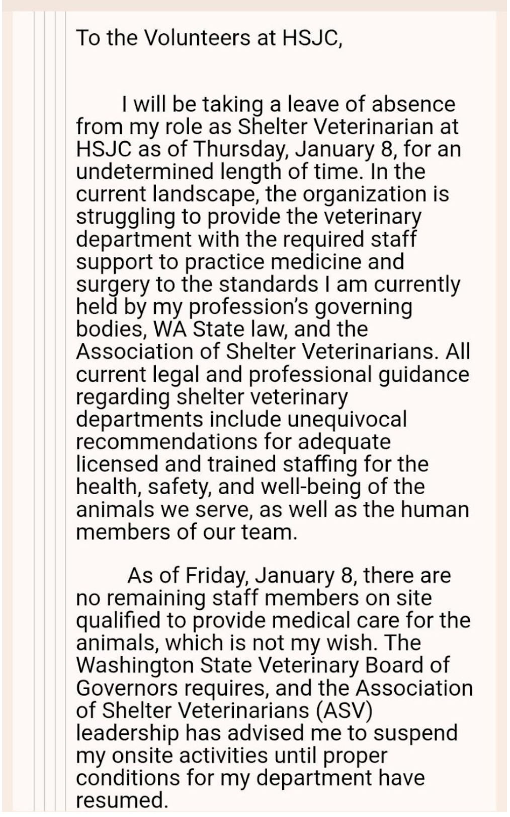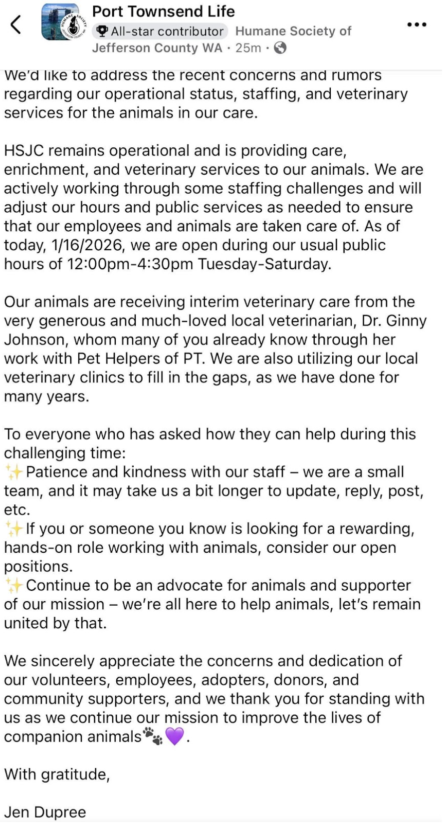 Dupree did not respond to a request for comment from the Beacon. She instead addressed the community in a Facebook post shortly after our request, stating HSJC “remains operational, is looking for new staff, and is providing veterinary care through interim arrangements with local vets.”