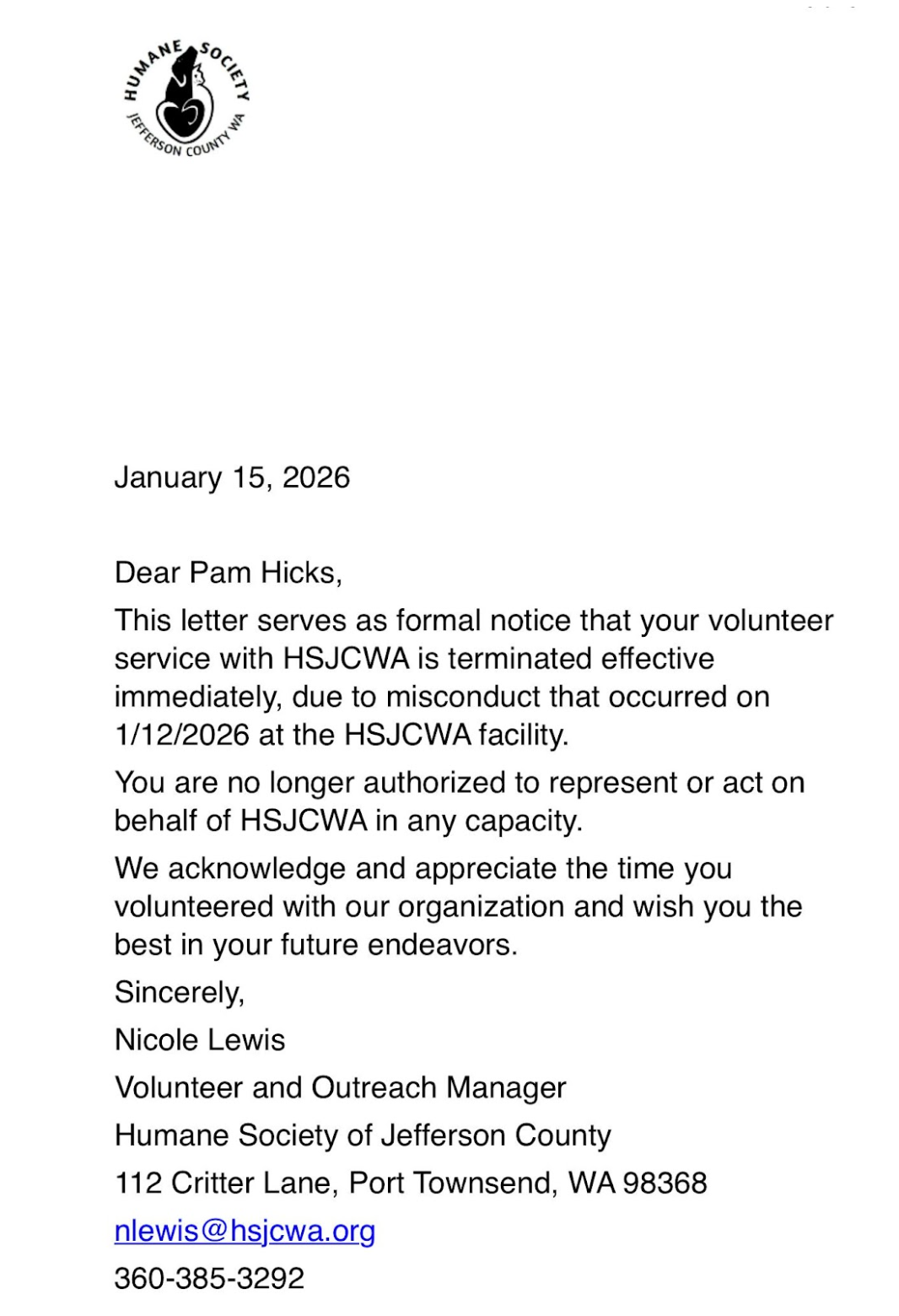 It wasn’t just employees who were fired after expressing safety concerns. Volunteer Pam Hicks had volunteered and fostered with HSJC since January 2024. Hicks described an interaction on Monday, January 12, with Dupree and Operations Manager Amanda McQuade that led to the termination of her volunteer role. Hicks was frustrated that the required leash-sanitizing solution was unavailable at the start of the volunteer shift. She interrupted a conversation between Dupree and McQuade to request it and was told it needed to be ordered. When Hicks challenged that statement, knowing a concentrate was on-site, she was told her tone was "inappropriate" and was asked to leave the property. She later received a letter of termination for “misconduct.”