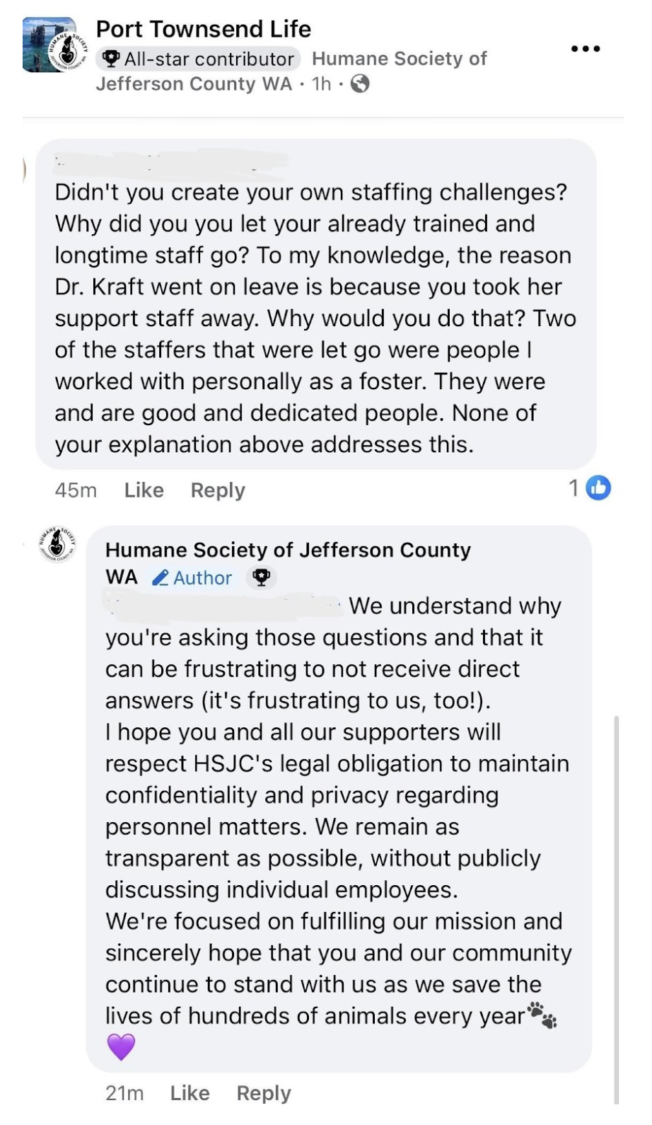 On social media, when directly asked by a community member why trained, long-term staff were let go, Dupree responded, “I hope you and all our supporters will respect HSJC's legal obligation to maintain confidentiality and privacy regarding personnel matters.”