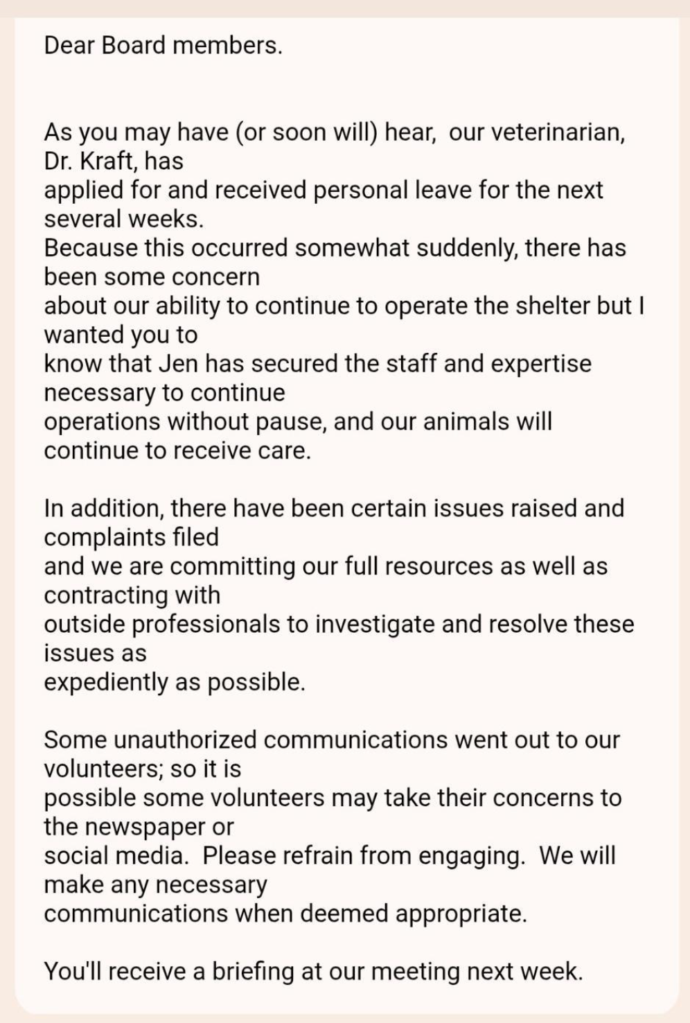 The shelter’s public website lists Dupree as Executive Director and Dr. Kraft as Shelter Veterinarian, though Kraft has taken a leave of absence due to the recent firings. The site shows active recruiting for a Licensed Veterinary Technician and an Animal Care Assistant; the positions held by LeDenican and Conley were recently terminated. Dr. Kraft sent the following email to the volunteers explaining her decision. She has been unavailable for comment.