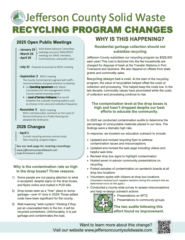 One of the most visible changes will be the removal of all unstaffed county recycling drop boxes at Port Ludlow, Port Hadlock, and Kala Point. County officials cite persistently high contamination rates as the primary reason.
