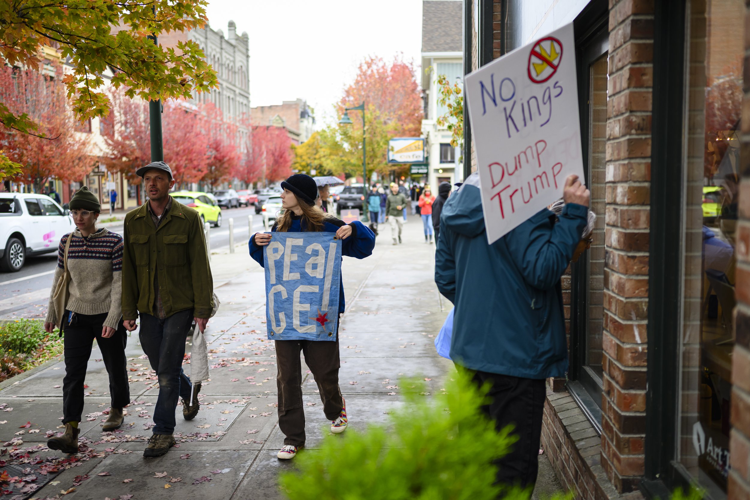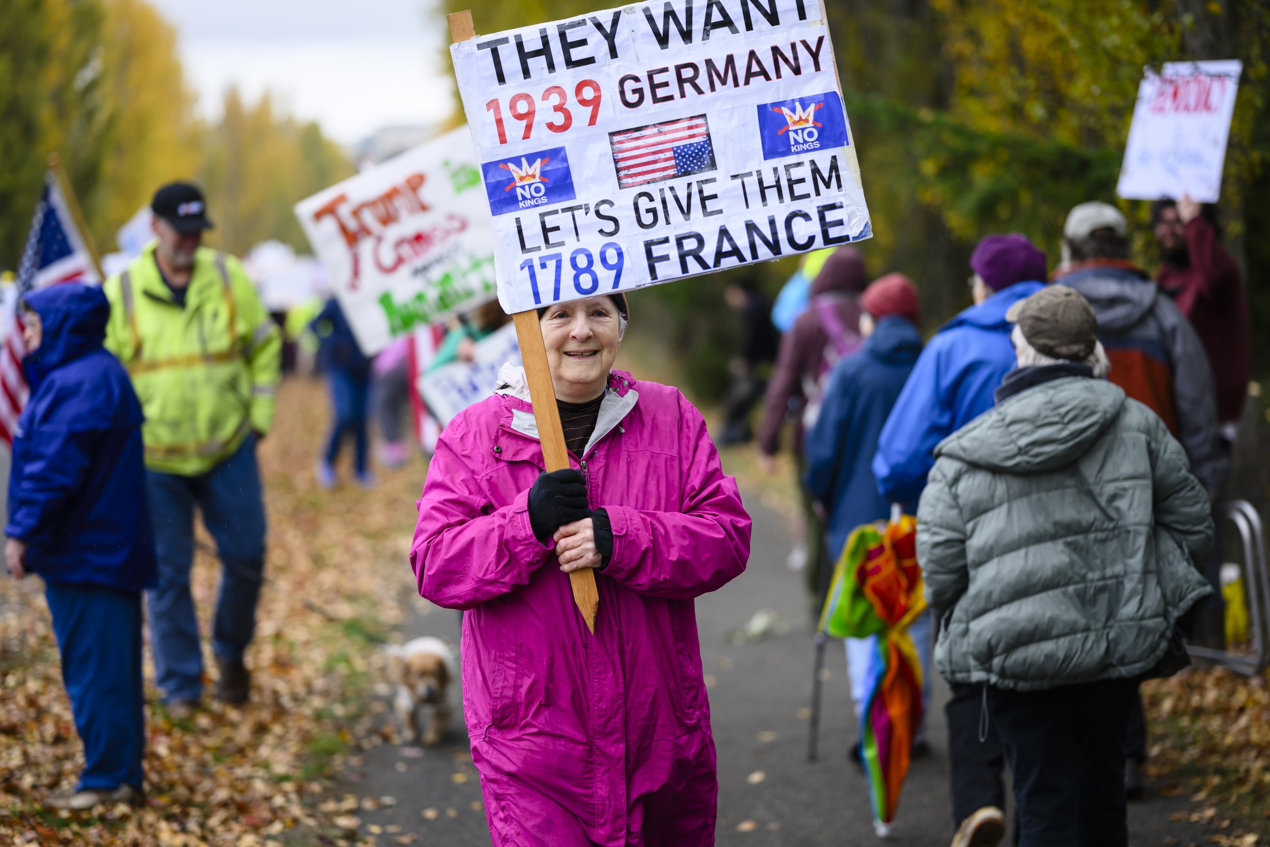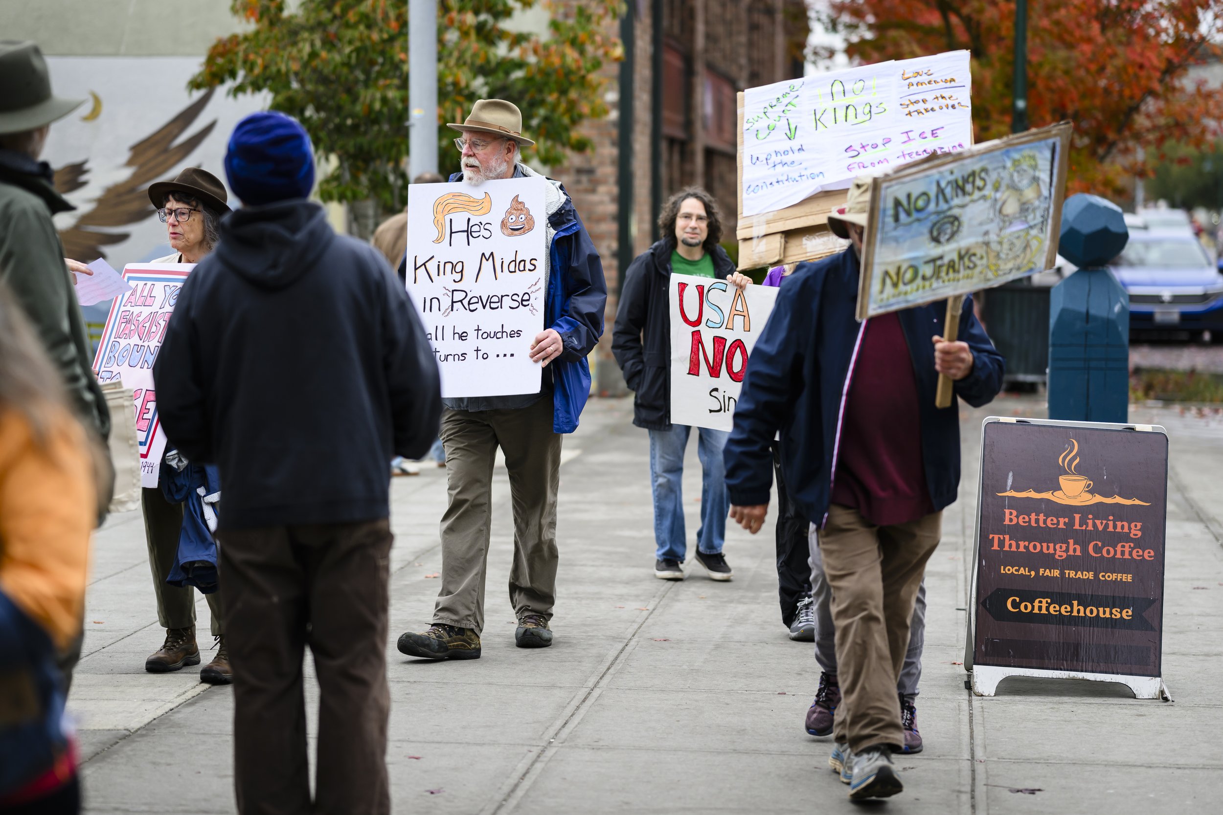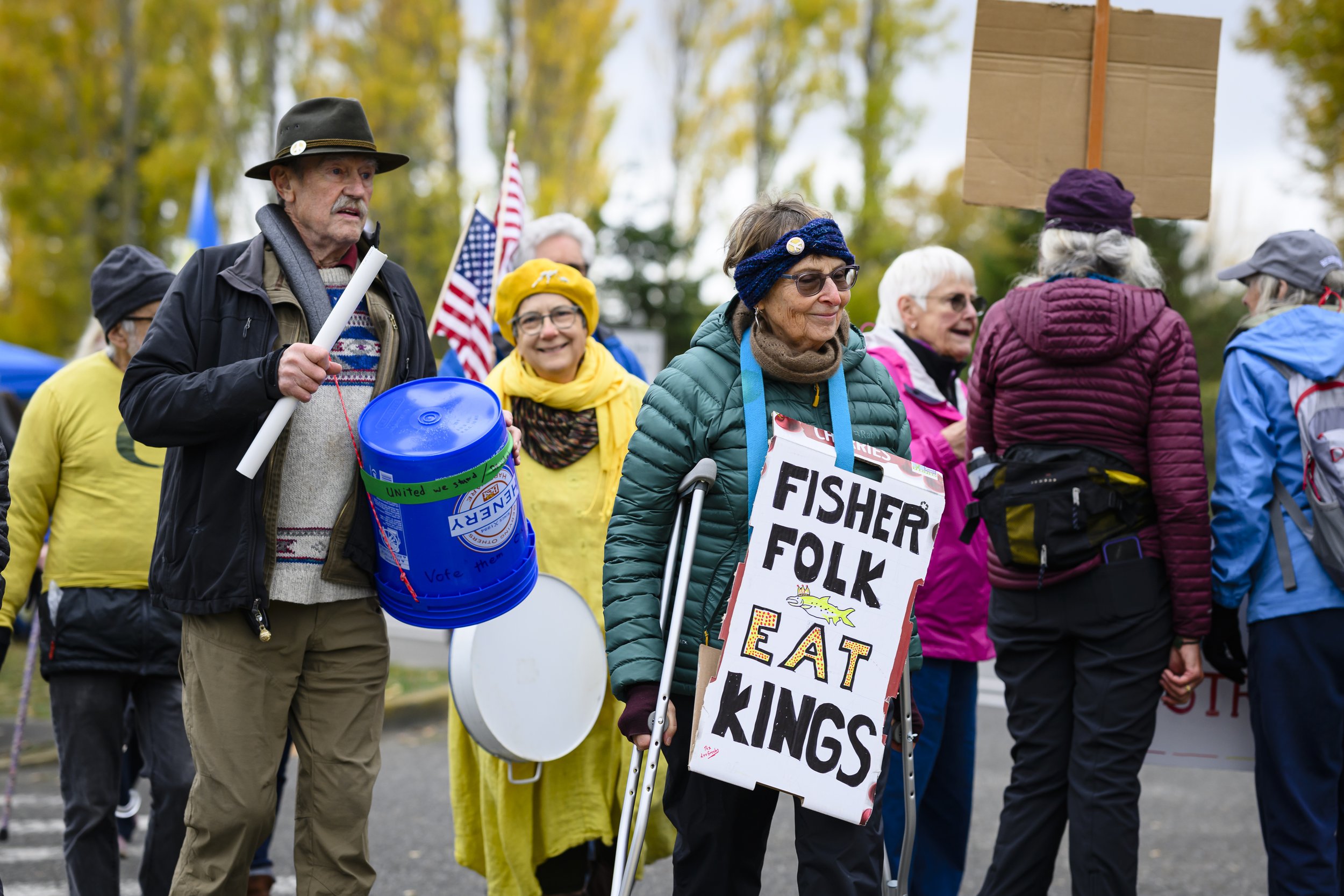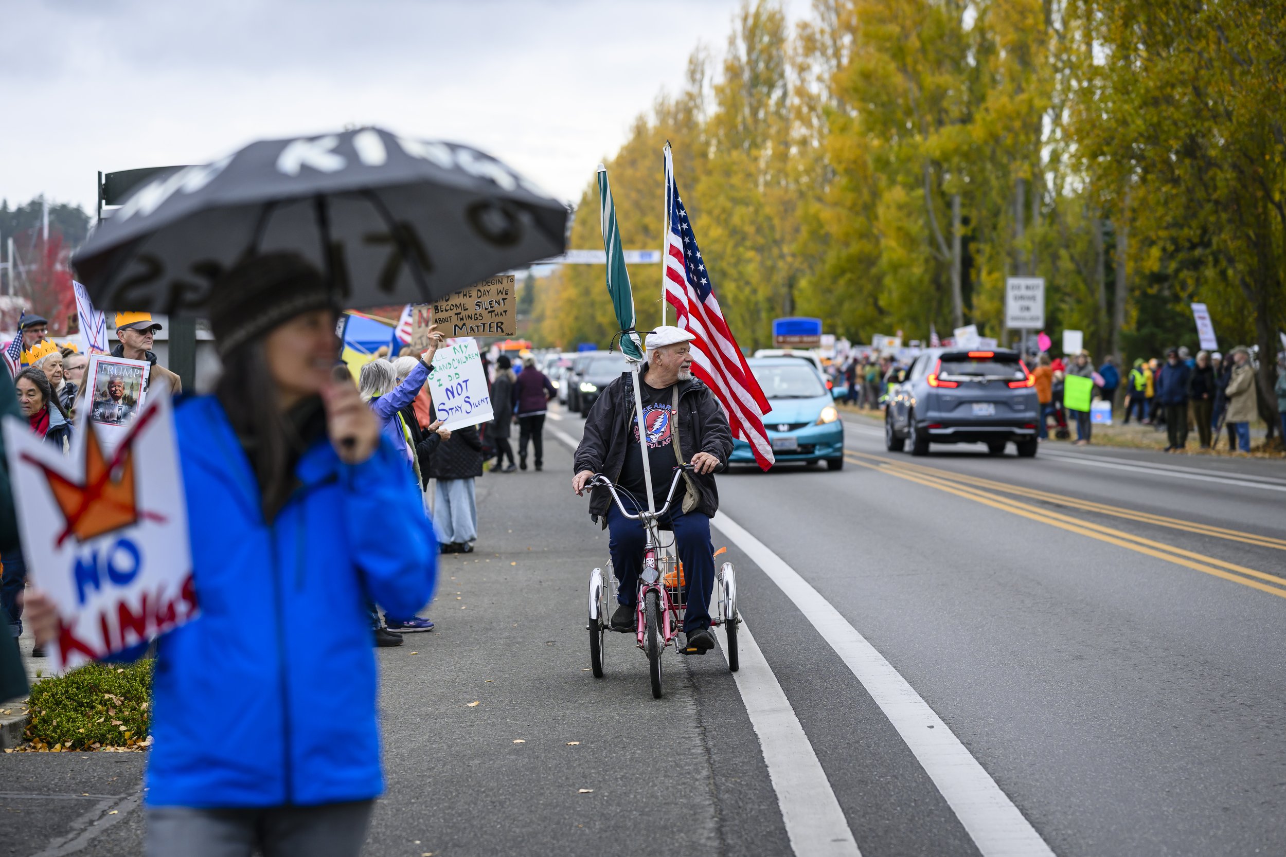 Approximately 3,000 protesters gathered along Sims Way, with many marching from Kah Tai to Salmon Park. In addition to the sentiments expressed through creative signs, participants also discussed “spreading hope,” “defending democracy,” and outrage towards ICE’s tactics. According to Gina Mcather, the chair of the Leadership Team at Indivisible Port Townsend, approximately 800 people attended the first protest in January 2025, putting Saturday’s attendance at triple the initial participation nine months into Trump’s presidency.