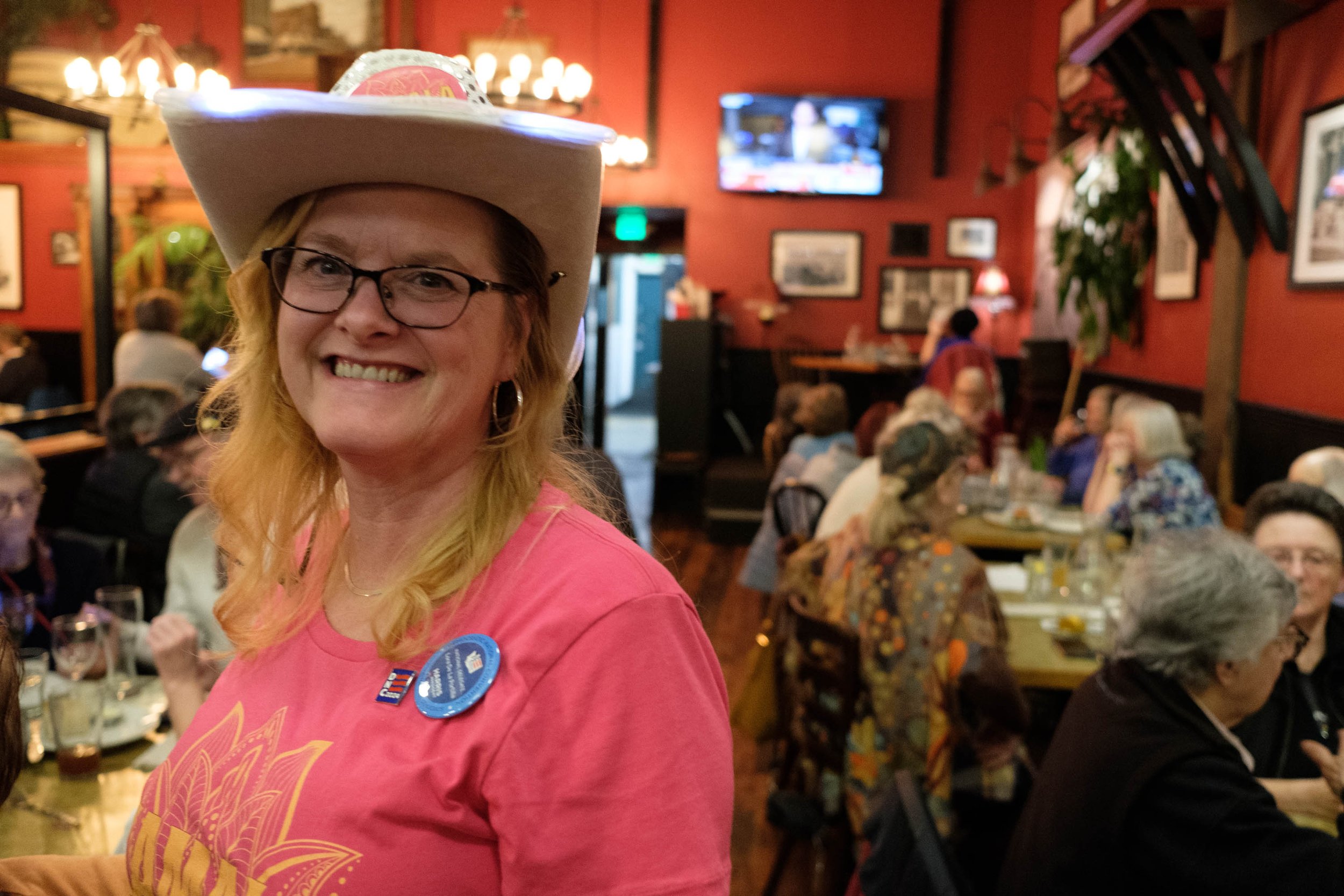 “The nerves kick in, the votes are being counted, we’ve got to wait and see what happens,” said Marty Gilmore, chair of the Jefferson County Democrats, at around 7 PM, his eyes frequently wandering to one of the big-screen TVs showing national election results.