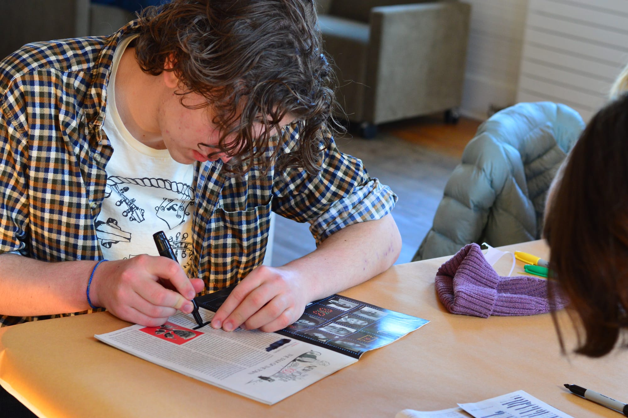At the next table over, a pair of Boiler Room String Band musicians worked on redaction poems, using pages from the New Yorker magazine. Violinist Xavier Cooper said he opted for this form since redaction has been prominent in the news lately. Bandmate Millie O’Neill, who plays guitar and upright bass, chose the crossword puzzle and found that the clues are, in a way, poetic.