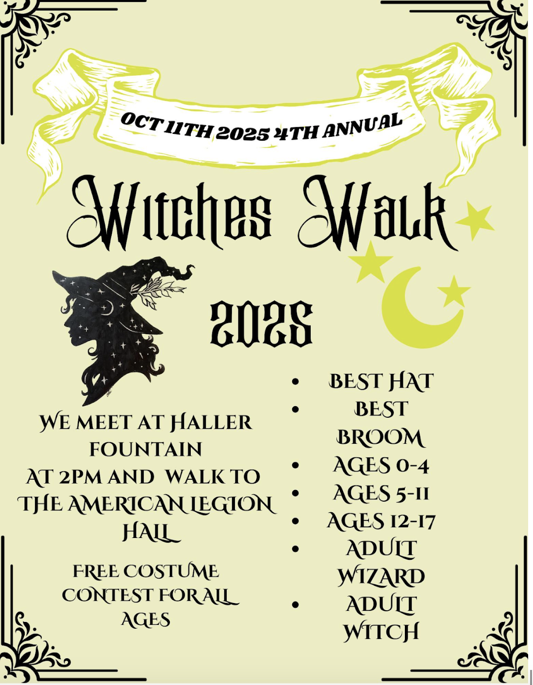 And last but certainly not least, The Witches Walk Spooktacular gathers the coven for its fourth year. Meet your fellow witches at Haller fountain at 2 pm and parade in broad daylight to the American Legion. There will be a costume contest and a costume exchange to trade up for new ghoulish garb. All of the kiddies will receive a prize and a candy bag.