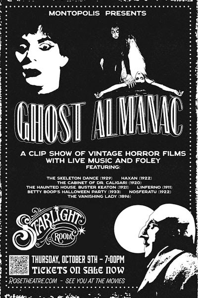 Speaking of red giants, our historic giant red blossom of cinema, the Rose Theater, has a night of audient terror scheduled in the Starlight Room. No, it is not the farewell to Downton Abbey, something we all thought was long dead already. It is Montopolis Presents Ghost Almanac. It will be a night of music, sound effects and classic horror, with vintage synthesizer music accompanying old-time horror films. Montopolis is the musical project of Justin Sherburn. The touring Ghost Almanac queries: “What if the devil was a VJ? What if MTV broadcasted from hell?”