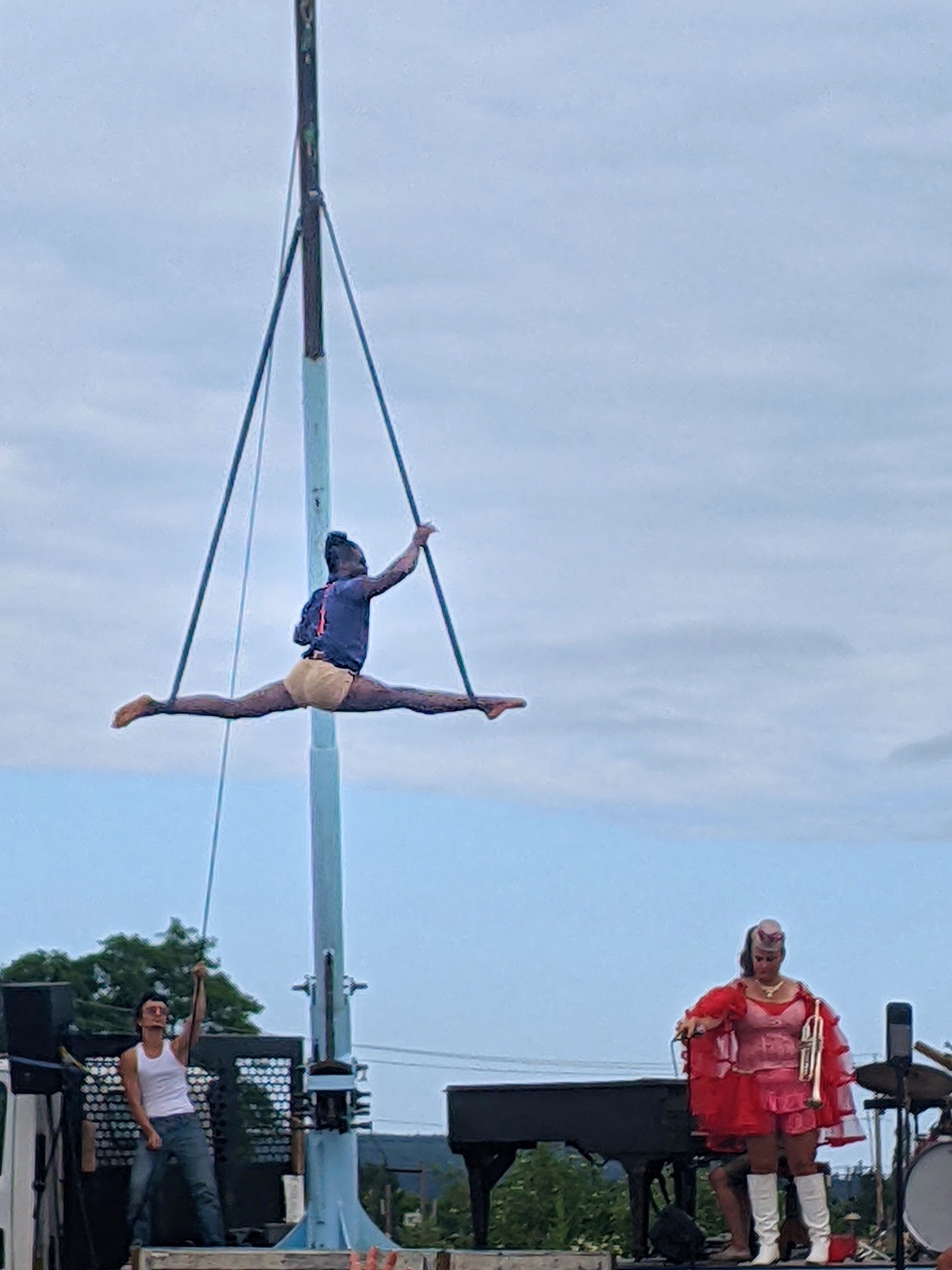 MC Dan didn’t disappoint, ending the show with a rendition of the crowd favorite “I gotta mop”, reworked for the key theme as “I gotta fob” (I can’t believe it, it’s the best day of my life!) If you know, you know. What impresses me about a good circus is the teamwork and the multifaceted talents of each of the performers. UP, UP UP is a compact, fast-moving, and efficient outfit with the action never leaving the truck and crane and with every number featuring live musical accompaniment by the non performing cast.